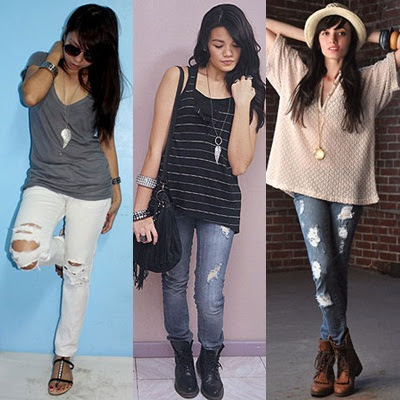 Para calçar, opte por mais femininos, como sapatilhas, ankle boots, peep toe, e rasteirinhas no calor.O que se vê muito com o jeans rasgado é a barra dobrada, que dá um toque a mais ao look.A bota mais usada é a no estilo coturno (fiz um look assim esse dias e ficou muito legal), prevalece o estilo rocker,e orna mais ainda com camisa de banda e jaqueta de couro (que pode até se colorida).